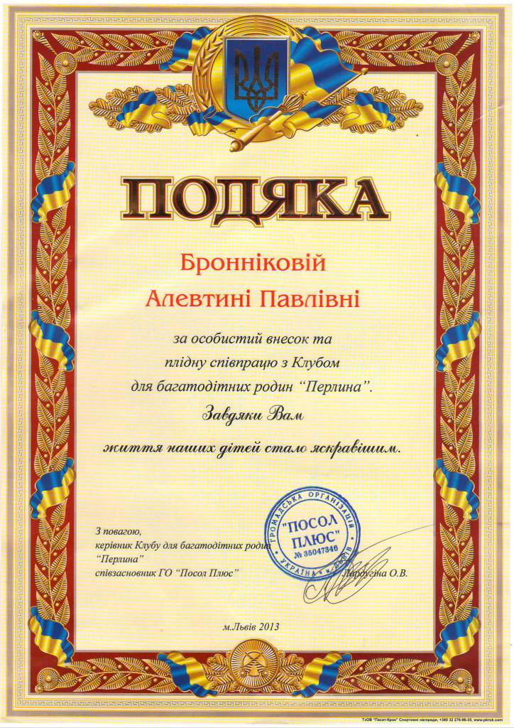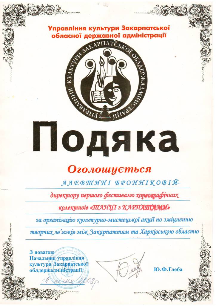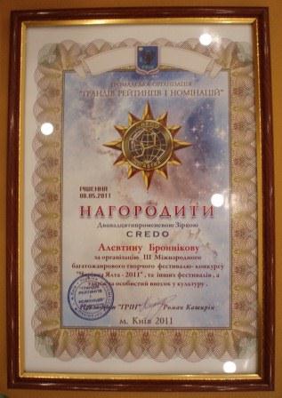 В мае 2011 г. за серию авторских фестивалей - "Танцы с Карпатами", Ужгород, "Жива вода", Трускавець, "ЧаривнаЯлта", Ялта, "Танцы с Артеком", Гурзуф, "Квітка на камені", Каменец-Подольский, и личный вклад в развитие культуры Бронникова А.П. была награждена двеннадцатилучевой Звездой "Кредо" (в переводе с латыни - «Верю»)
